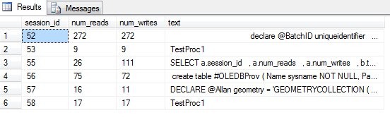 SELECT a.session_id , a.num_reads , a.num_writes , b.text FROM sys.dm_exec_connections a CROSS APPLY sys.dm_exec_sql_text(a.most_recent_sql_handle) b