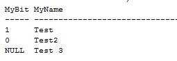 INSERT BitTest SELECT 1, 'Test' INSERT BitTest SELECT 0, 'Test2' INSERT BitTest SELECT NULL, 'Test 3' SELECT * FROM BitTest