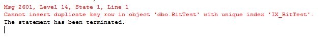 CREATE TABLE [dbo].[BitTest]( [MyBit] [bit] NULL, [MyName] [varchar](50) NULL ) ON [PRIMARY] GO USE [db1] GO CREATE UNIQUE NONCLUSTERED INDEX [IX_BitTest] ON [dbo].[BitTest] ( [MyBit] ASC )WITH (PAD_INDEX = OFF, STATISTICS_NORECOMPUTE = OFF, SORT_IN_TEMPDB = OFF, IGNORE_DUP_KEY = OFF, DROP_EXISTING = OFF, ONLINE = OFF, ALLOW_ROW_LOCKS = ON, ALLOW_PAGE_LOCKS = ON) ON [PRIMARY] GO