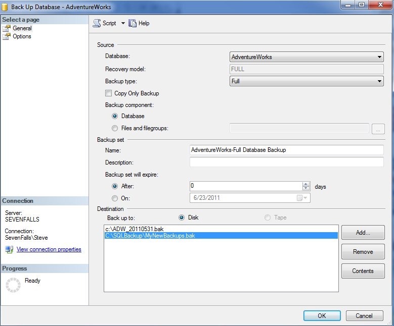 When I started working with SQL Server I got bit in the rear one day while I was testing backups. I was in the process of making a quick backup before I deployed some changes. I think this was in the Enterprise Manager days of SQL 2000, but it could have been v6.5. In any case, I had a dialog similar to this one that I’ve shown in Management Studio. For simplicity I’ve recreated this with AdventureWorks: