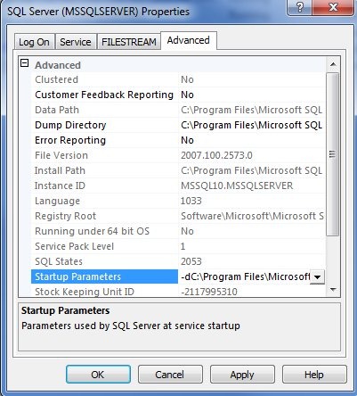A couple quick notes, on the Service Tab you can set the startup mode (Manual, automatic) for the database engine.