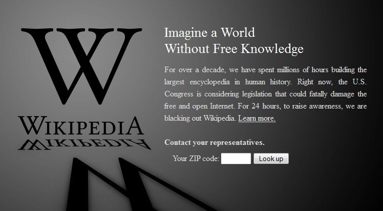It’s anti-SOPA/PIPA day, and a number of sites have shut down for the day. O’Reilly closed their page, and of course, Wikipedia shut down.