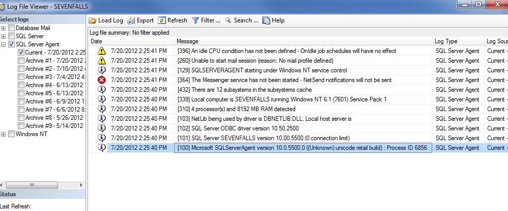 A similar feature exists for SQL Agent. When you build a job, you can select a schedule that runs when the Agent starts. Imagine that I have a procedure that logs when my agent starts. I want this to log the datetime when the agent starts. I know it’s in the errorlogs, but if I have a lot of restarts in a short time, I could lose that information.