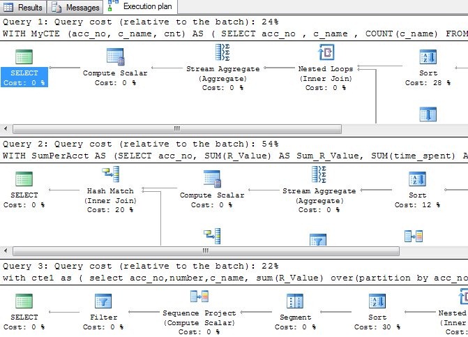 I didn’t think mine was great, using a CTE and a subquery felt slightly inefficient, but was it really inefficient? I grabbed the third solution, which was similar to mine, and put both in SSMS. I then ran both pieces of code together, after clicking CTRL+M (include Actual Execution Plan).