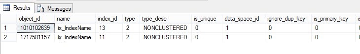 I haven’t done much index maintenance in the last few years, but since I had specified the name, and I expected names to be unique, I was surprised. That’s not the case, however, since indexes aren’t seen as objects.