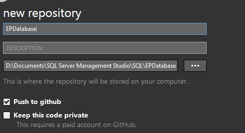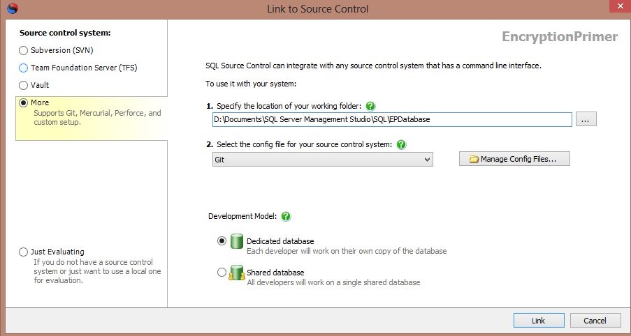 The next step was to link this with Git. After selecting my database in the Object Explorer, I switched over to the SQL Source Control tab to link my database to source control. I entered the path of my Git folder (from above) and selected Git as my VCS.