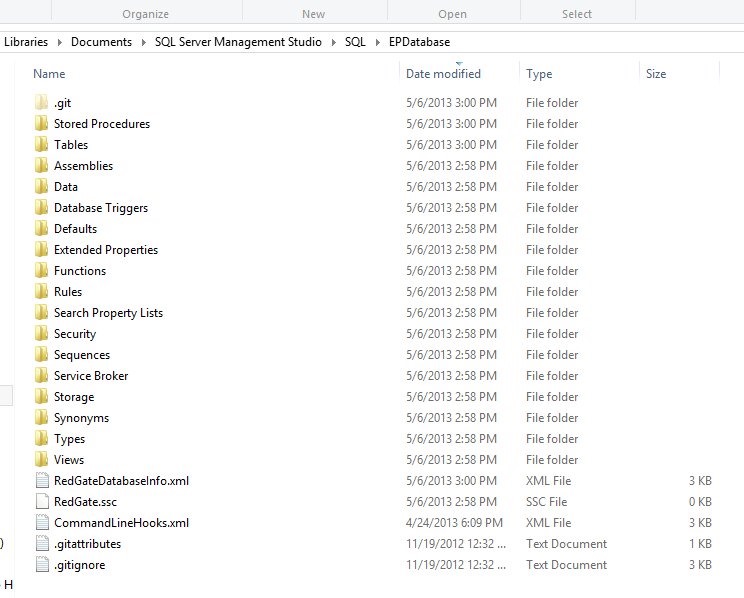 If you have an existing database, this is the situation you’ll find yourself in most of the time. You link it, and commit all the changes. Once you enter a comment (please enter real comments you’ll understand), and press Commit, the objects are added to your folder. If I look at the folder, I see more stuff: