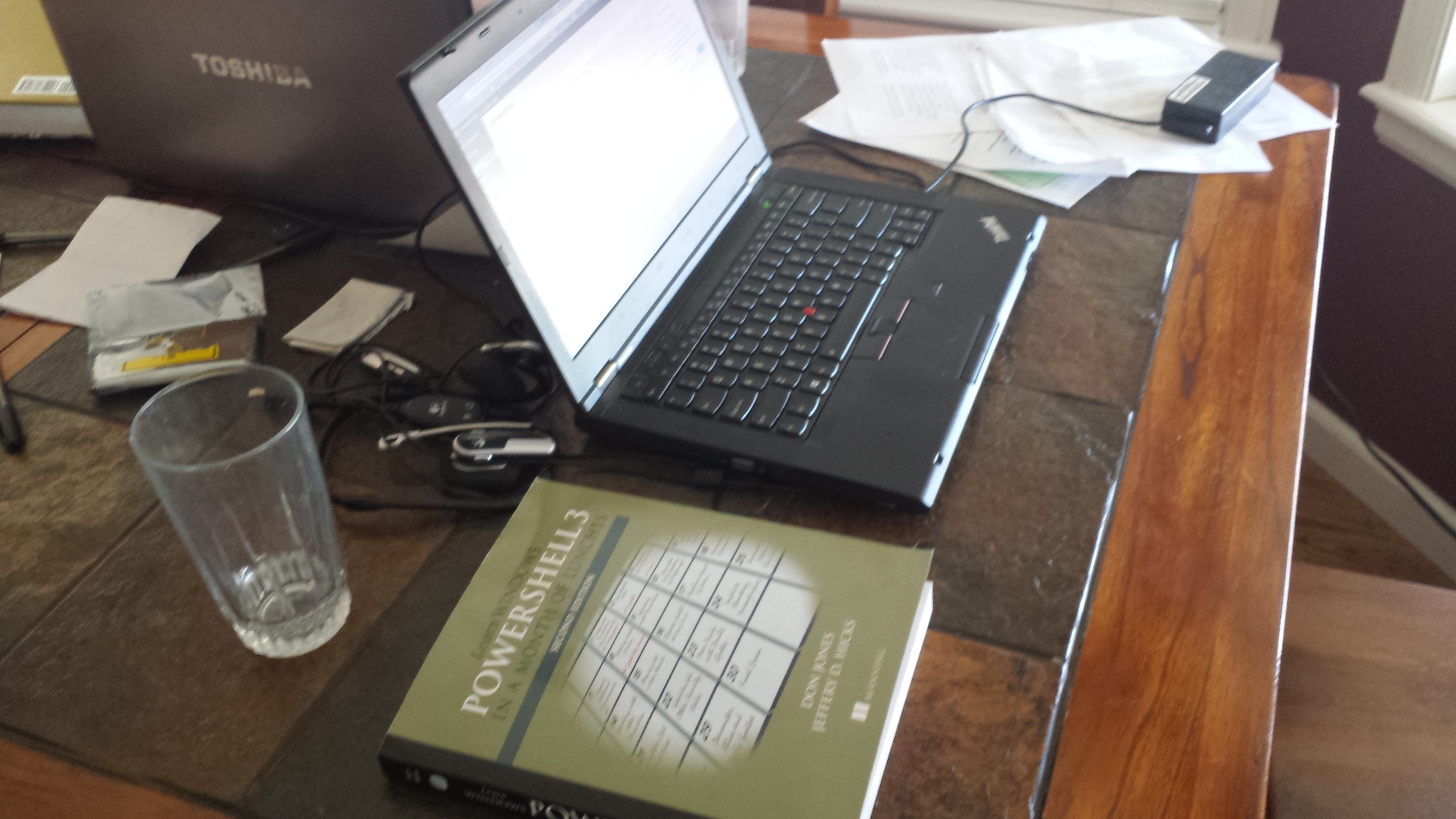 I got started on Learn Windows Powershell 3 in a Month of Lunches at lunch one day. Working at home makes this easy as I have a computer and a kitchen near each other. In this case, a salad, a bowl of chili, and the laptop next to the book to get started. The picture below was post-chili.