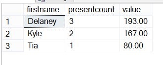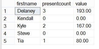 SELECT p.firstname , presentcount = COUNT(ps.present) , value = ISNULL(SUM( ps.value), 0) FROM people p INNER JOIN presents ps ON p.id = ps.id GROUP BY p.firstname