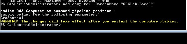 I did get an error on one of my VMs. It was error 0x21C4 on a Server Core installation. When I looked that up, I got a duplicate SID error. I had sysprep’d the machines, but perhaps I broke something. In any case, I re-ran sysprep, reset the network config, renamed the computer, and then joined the domain as noted above.