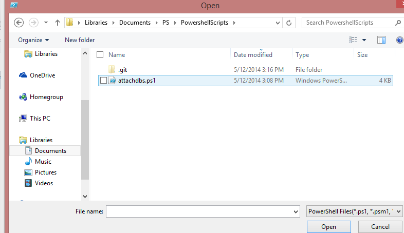 Click File –> Open, or click the open Folder button, and get a dialog to open a file. I stopped doing that soon after I began playing with PowerShell because I was typing most of the time, and it was easier to do this: