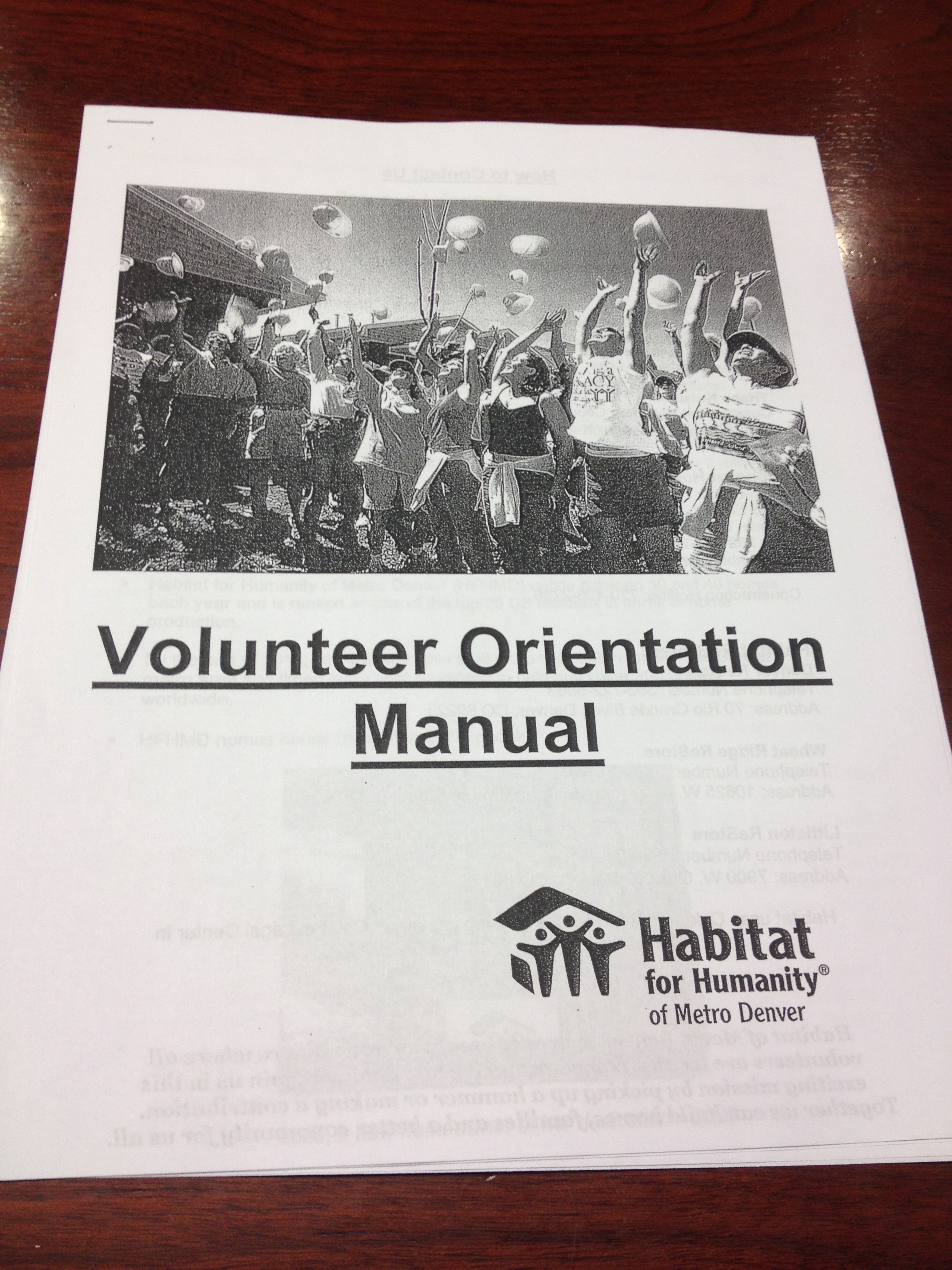 One of my sabbatical decisions was the volunteer for Habitat of Denver, and I began that journey by attending a volunteer orientation and filling out paperwork. In a few days my name should be in their database and I’ll be able to start signing up for shirts at builds and the ReStores that Habitat runs. I’m looking forward to getting a few shifts a week at their stores, and I’m hoping I can help them fulfill their mission.