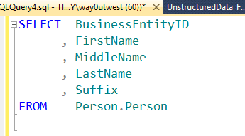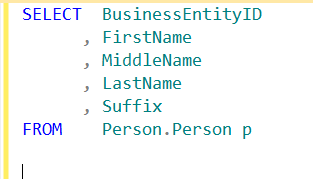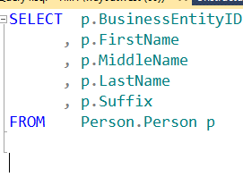 Note that my column names are listed with just the column name and don’t include the table from which they come. Not a big deal here, but as I enhance this code over time, I may add another table to a join, perhaps one that includes BusinessEntityID in it. In that case, I’ll get an ambiguous column error, and a squiggly in SSMS (shown below).