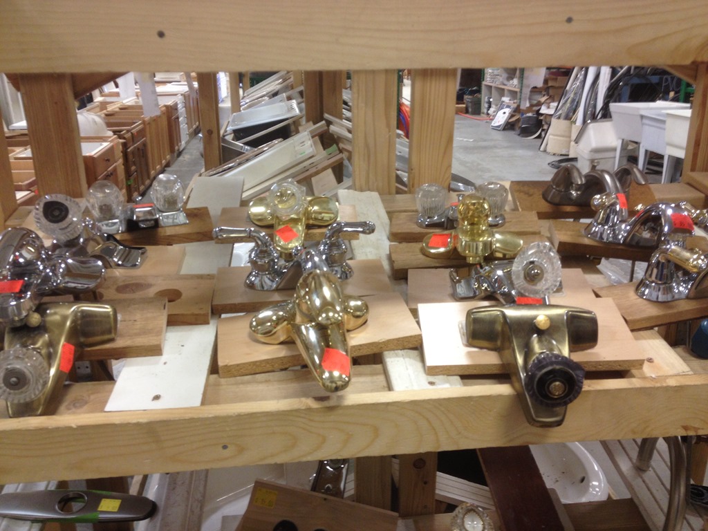 There are lots of faucets for sale, and more coming in all the time. They are displayed on wooden pieces that have 3 holes cut in them for the faucet to fit inside. The display area was about half full and the manager showed me the large pile of faucets in the back and asked if I’d mount and them them ready.