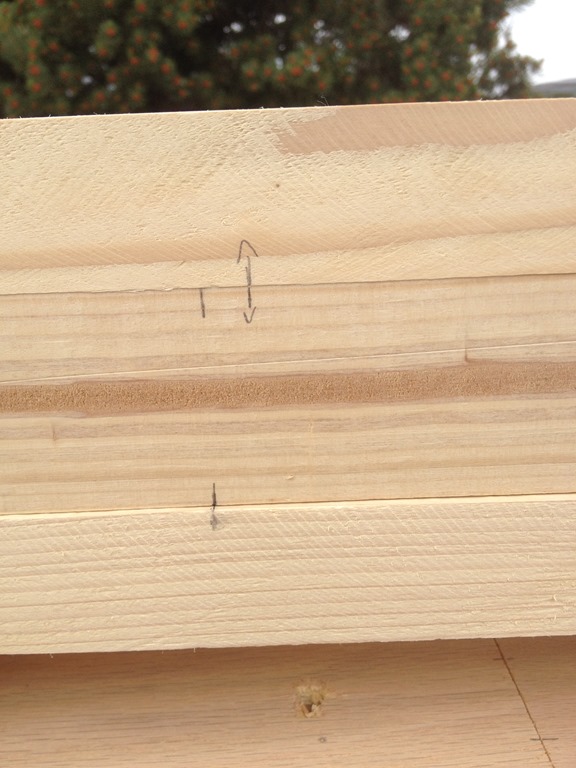 I remarked things, going slowly and adding arrows so I knew which ones to cut. Once that was done, I used a square to extend the marks to the sides where I need to cut biscuit slots. It was a little slow to mark all boards, and I worried about a few of the boards that were slightly twisted. However I’m hoping glue will move things over and since the biscuits allow some movement, I’ll see how things line up dry in the next few days.