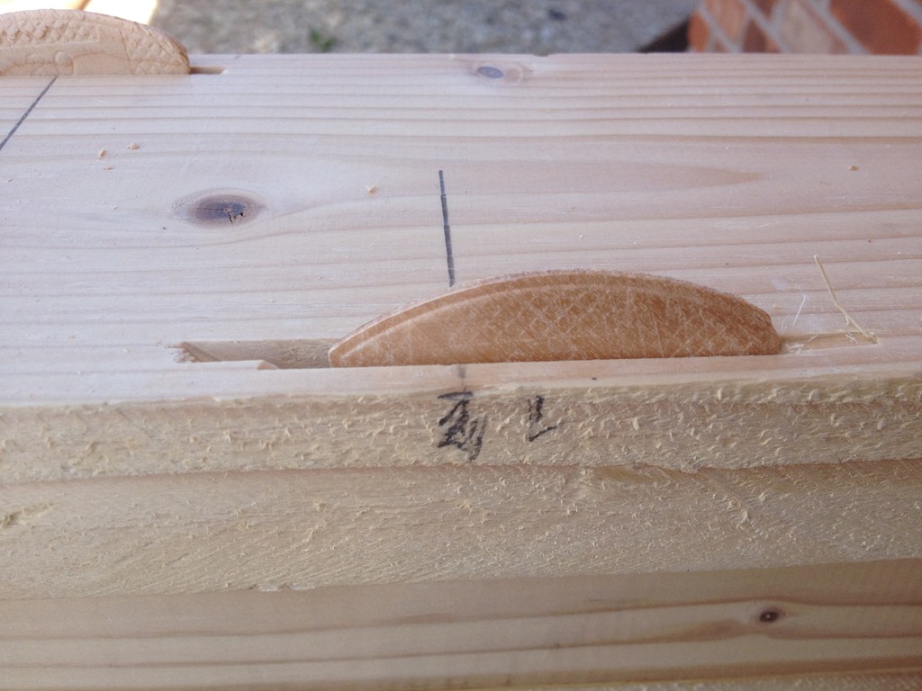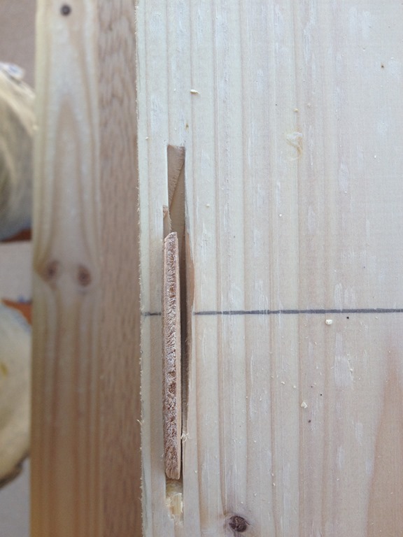 The mark on the left is where I marked and cut the first slot. When the top didn’t fit, I removed a number of biscuits, lined things up and clamped them down. I then managed to re-mark (the right mark) and re-cut slots.
