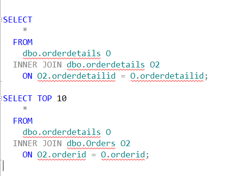 Note that the Orders table has “O” as an alias in the first query, but “O2” as an alias in the second query. This isn’t an issue when I’m writing a query, but when I revisit this code in a month or two and add an enhancement, it can be tricky.