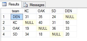 select * from ( select team , opponent , teamscore from scores results ) as rawdata pivot ( avg(teamscore) for [Opponent] in ( [KC], [OAK], [SD], [DEN] ) ) as pivotresults;
