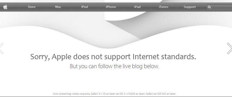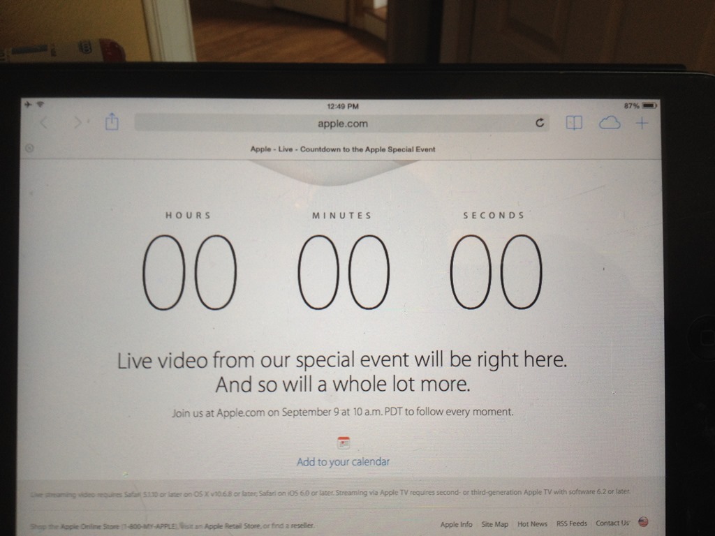 About 10 minutes before the event, the countdown switched, and noted that my browser (Firefox) wasn’t supported. I almost switched to Chrome, but then saw the fine print. I wasn’t thinking and didn’t take a picture as I ran to grab my iPad, but Karen Lopez posted an “altered” version of the Apple page.