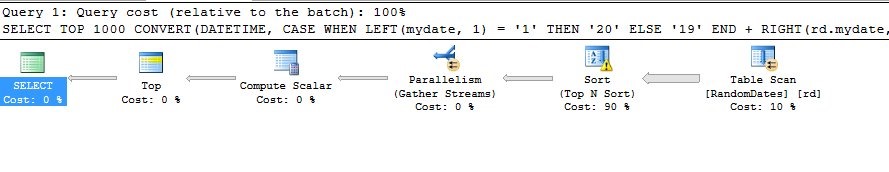 That’s interesting, and it matches what I’d expect. The first code is much simpler, intuitively, and it’s easy to read. With the format of the date essentially in order, it doesn’t make sense to try and "assemble" the date from parts. It’s easier to convert the first character to two (with the CASE) and then just cast this as a date.