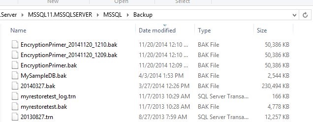 This will return to me a list of the files. That’s what I want, but I want to limit the files to a pattern. In this case, I’m looking for .bak files, from the EncryptionPrimer database. All of these