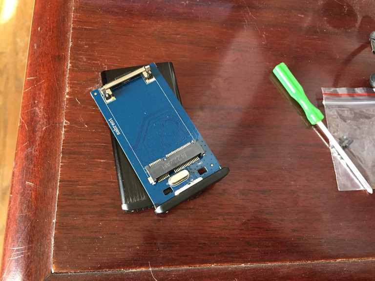 I wasn’t planning on replacing the SSD too quickly, but when I saw a sale from Crucial over Christmas, I ordered a new mSATA drive. I hadn’t really paid attention to the format, thinking this would be similar to my other small SATA drives, but it wasn’t. It’s a card, as in a small SD card sized device.