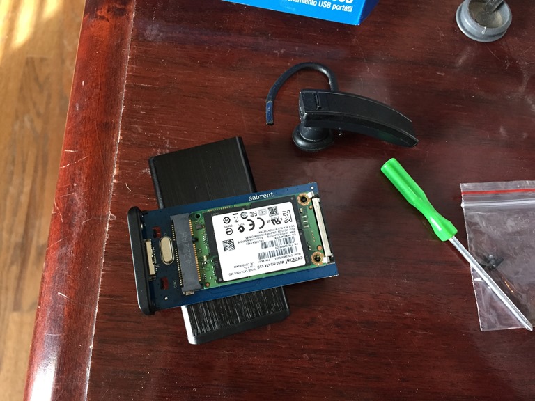 I also ordered an external case for is, a Sabrent one that was highly rated on Amazon. Here is the collection of the case and drive. For scale, my Bluetooth headset is in the picture.