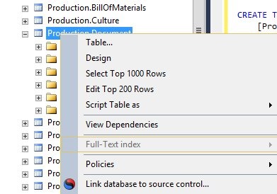 I logged on to AdventureWorks and right clicked the Production.Document table. I knew that had full text indexes because I’d tested them before. However, what I got was this: