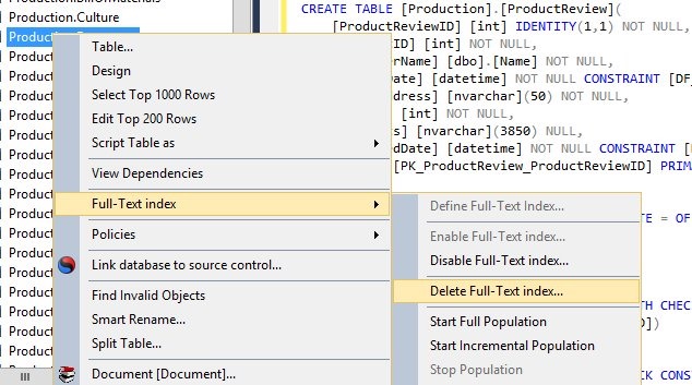 Once this was done, I could run SSMS and sure enough, I could delete the FTS indexes (shown below).