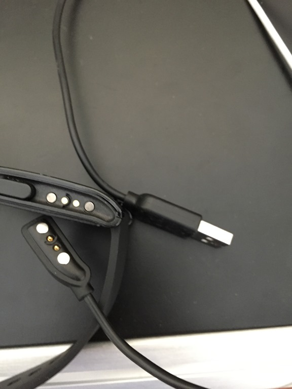 The small box the Pebble came in just had the watch and a cable. You can see the multiple contact cord (with USB) and the matching connectors on the watch. This is a magnetic connection, like some laptops use. It easily connects and disconnects.