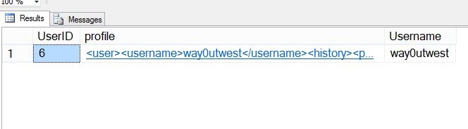 CREATE TABLE UserProfile ( UserID INT IDENTITY(1,1) , profile XML ); GO INSERT INTO dbo.UserProfile ( profile ) VALUES ( N'<user> <username>way0utwest</username> <history> <pageurl>/default</pageurl> <pageurl>/scripts/</pageurl> <pageurl>/scripts/id/2433</pageurl> </history> <points> <forums>32432</forums> <qotd>1123</qotd> </points> </user>' );