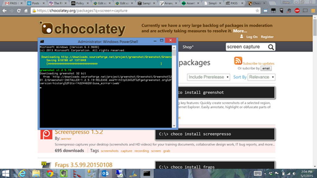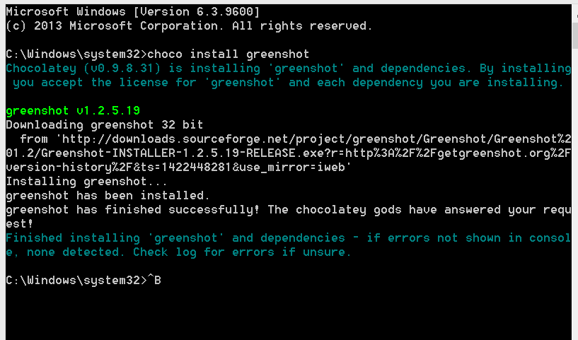 I quickly opened an administrative level command prompt and typed “choco install greenshot” and went along with my work.