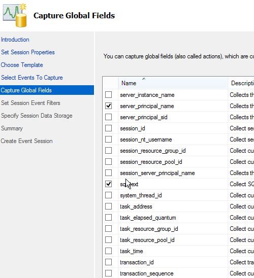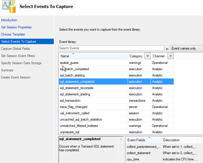 Now I need to pick the events. There are a lot, but I went down to get the sql_statement_completed as my event. This will let me see the text of a call, which is what I need.