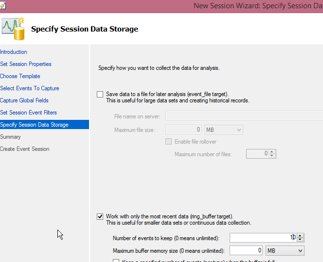 I have to choose where to store this data. Since this is mostly a check for me, I can just use the ring buffer and keep data in memory. I lowered this to 10 events, but you can certainly pick what works for you. If you care about auditing, drop this in a file. For a small session like this, there’s not much data that’s going to be captured.