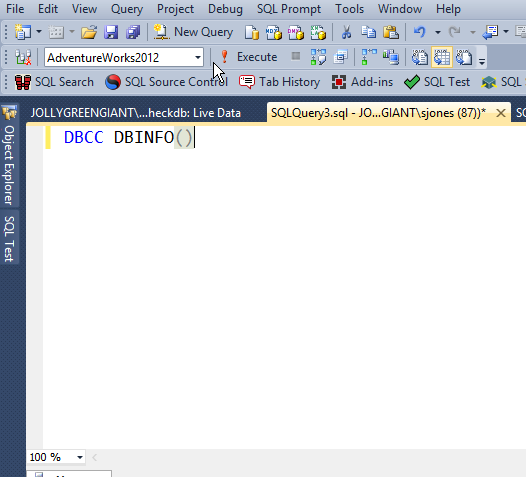 Still a blank, live data screen. Then I ran checkdb. I saw the results, and then ran it a few more times.