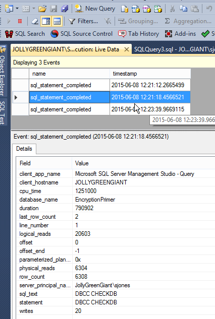 As you can see, I now can see that I ran checkdb against the EncryptionPrimer database.