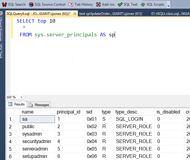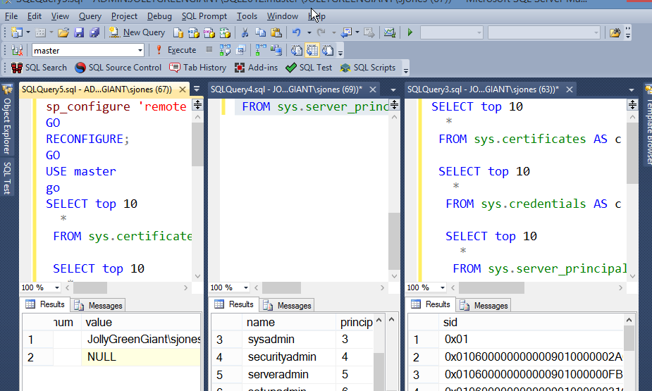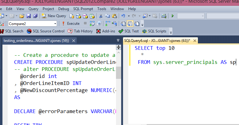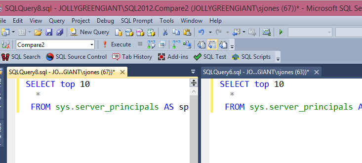 Now I have two places to work on code. In my case, I wanted the before and after view of Server_principals as I checked some admin changes. I could do things and keep re-running the query in one of these windows, but keep the results from the other one visible.