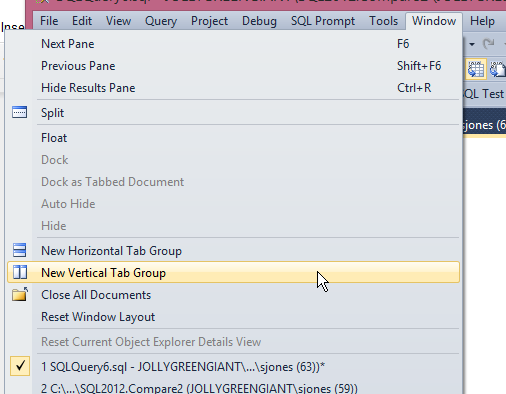 A few years ago I was watching Brent Ozar tune queries at an event and one of the things he wanted to do was compare two queries and their execution plans. He used vertical tab groups, which is a great way of seeing two things at once.