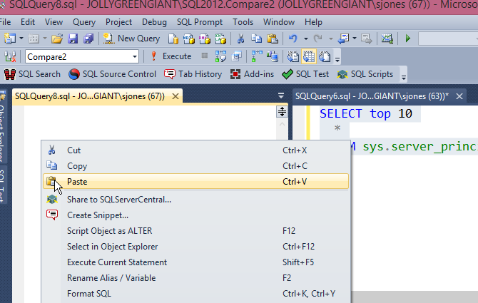 I selected the left hand query, then clicked "New Query" to get a blank window. I then cut and pasted my code from the right to the left. This is exactly what you might want to do when tuning queries, keeping the original on the right while you work on the left.