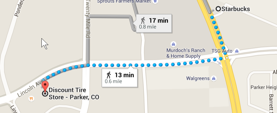 I had to get a tire fixed this morning. I actually owned a replacement tire, so I just needed someone to mount it on the existing wheel (the existing tire needed to come off). I stopped by Discount Tire this morning in Parker, and I had a quick conversation with the salesman, Brian. He arranged for the service, even gave me a discount, and told me it would take about an hour.