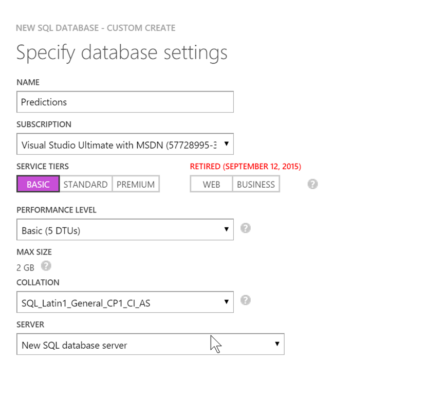 You get the settings page. The first thing you need is a database name. You can pick your subscription as well as the size of the system. Be aware of charges when you pick sizes. S0 is not cheap.