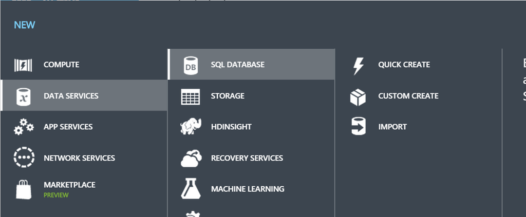 I select SQL Database and then click “Custom.” You could click quick create, but I wanted to show more options. There aren’t a lot, but you can put in a few.