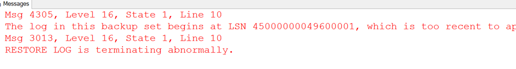 The fix is easy; restore the correct files in the correct order. In this case, I knew I’d taken 3 log backups, and I was restoring in the incorrect order. I’d restored log backup 1, and was now trying to restore log backup 3.