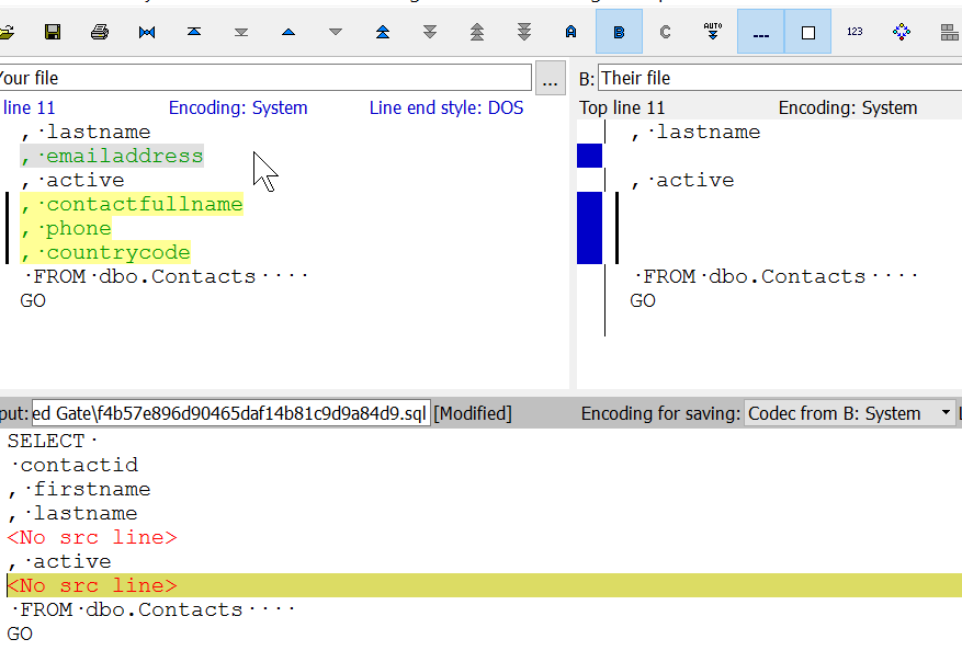 If I now save and close KDiff3, I’ll get the merged code in SSMS and SQL Source Control.