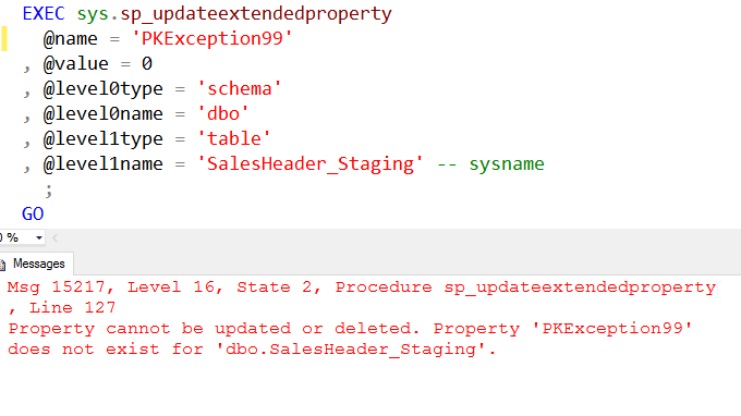 EXEC sys.sp_updateextendedproperty @name = 'PKException' , @value = 0 , @level0type = 'schema' , @level0name = 'dbo' , @level1type = 'table' , @level1name = 'SalesHeader_Staging' -- sysname ; GO