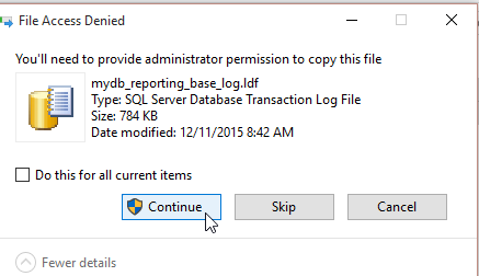 The next step is to delete the MDF and LDF files, which will be mydb_reporting.mdf and mydb_reporting_log.ldf by default. I could specify other names, and would if this were something I needed to script.