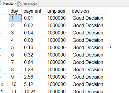 Steve, I think your initial response to your mom was correct given that it is a trick question ;-). Since the other option was “a penny on day 1, with the note that each day of the month, she’d double what I’d gotten the first day”, then you would only be getting $0.02 each of the rest of the days of the month because that is double what you got on day 1. So with 30 days left, that is $0.60 on top of day 1 for a total of $0.61. 🙂