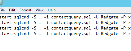 A better way is to use a SQLCMD call with my query in it. In this case, I’ll create a notepad file and add multiple SQLCMD calls in it.