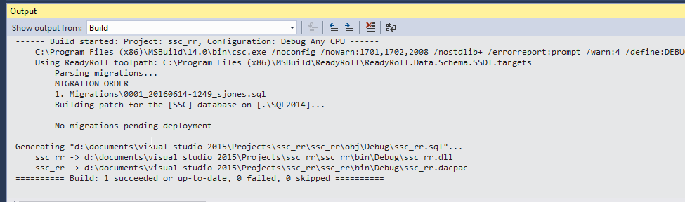 I can see this if I do a Visual Studio build. Note the message in the middle: No migrations pending deployment. The changes in script 1 (001_20160614-1249_sjones.sql) are already in the db.