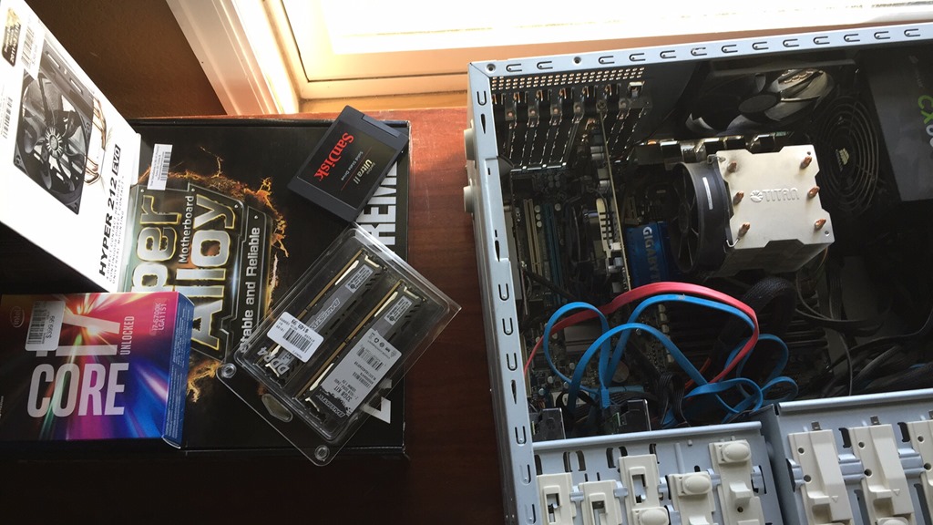 In any case, I had an i7-930, 24GB of RAM, and 4 drives with about 3TB of storage. However, the CPU was aging and I’d get temp alarms when doing heavy video processing. In the last 4-5 years, I’d replaced the power supply and CPU cooler, but still had issues. The Windows 10 upgraded added more, with some weird freezing and loss of the Start menu. I didn’t have all of those things on my laptops (both w10, one new, one upgrade), so I decided it was time to rebuild when a simple Skype call had temp alarms going off.